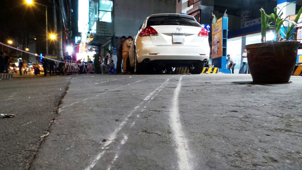 | Khi đến giao lộ với đường Nguyễn Biểu, chiếc ôtô không giảm tốc độ, lao thẳng qua ngã tư khiến nhiều người hoảng loạn tránh né. Chiếc xe "xe điên" rẽ nhanh sang phải tông trúng một người hành nghề xe ôm đang đậu đợi khách rồi lao thẳng vào cây xăng tông trúng hai xe máy và một xe đạp làm bốn người bị thương, trong đó có một bé gái vài tuổi và một nữ sinh cấp ba. |