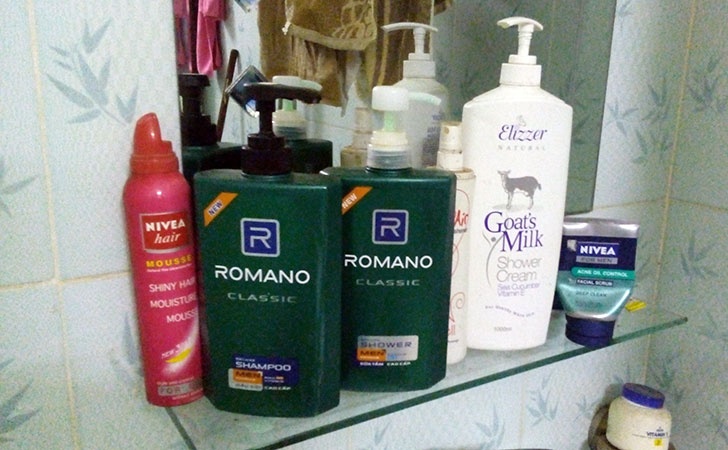 | Trong nhà tắm còn ngổn ngang những lọ dầu gội đầu, sữa tắm mà vị sư này sử dụng. Khi tập hợp lại có sữa tắm, sữa rửa mặt, dầu gội đầu, và một lọ có nhãn Nivea hair Mousse. Được biết đây là một loại keo bọt giữ nếp, tạo dáng cho tóc. |