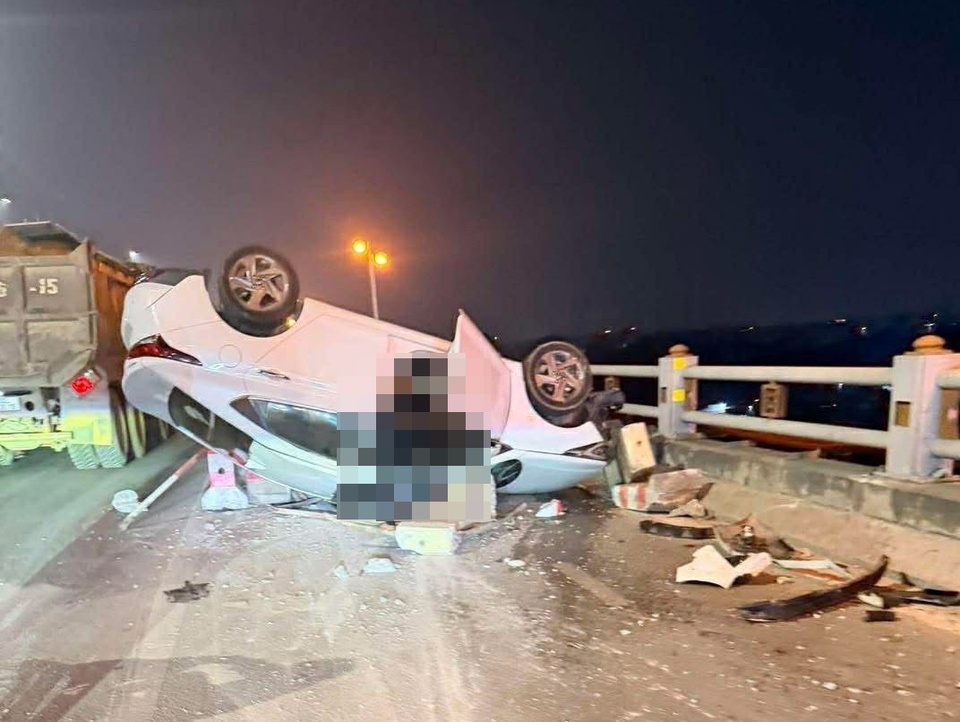 Vụ việc xảy ra vào khoảng 21h cùng ngày. Khi di chuyển trên cầu Thanh Trì (Lĩnh Nam, Hà Nội), ôtô con màu trắng mang BKS Hà Nội đã đâm vào dải phân cách làn ôtô và xe máy trên cầu. Cú đâm khiến chiếc ôtô lật ngửa, nằm chắn ngang làn xe máy.
