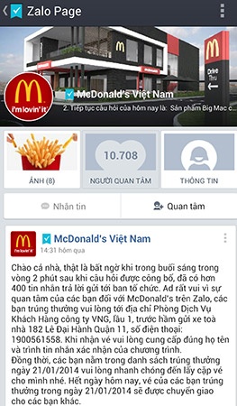 Trong khi đó, tên tuổi nội duy nhất trong cuộc đua OTT là Zalo lại bắt đầu với hướng đi riêng. Đầu 2014, Zalo được McDonald’s chọn là đối tác đầu tiên tại Việt Nam. Theo đó, với 7 triệu khách hàng trẻ, McDonald’s chọn Zalo là kênh quảng bá cho việc xuất hiện tại thị trường Việt Nam cũng như tặng các suất ăn miễn phí trước ngày khai trương.