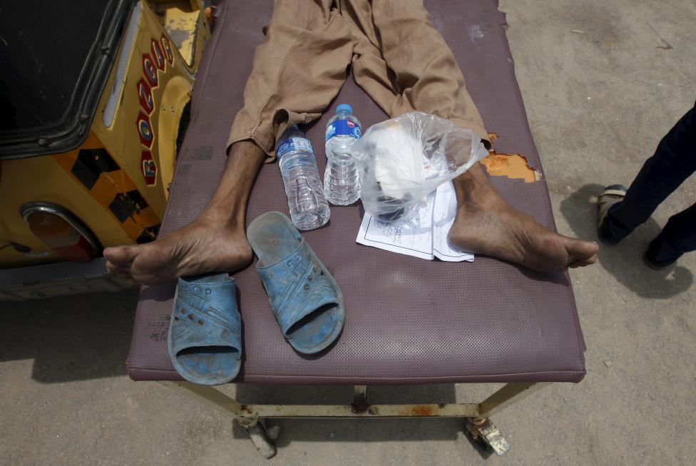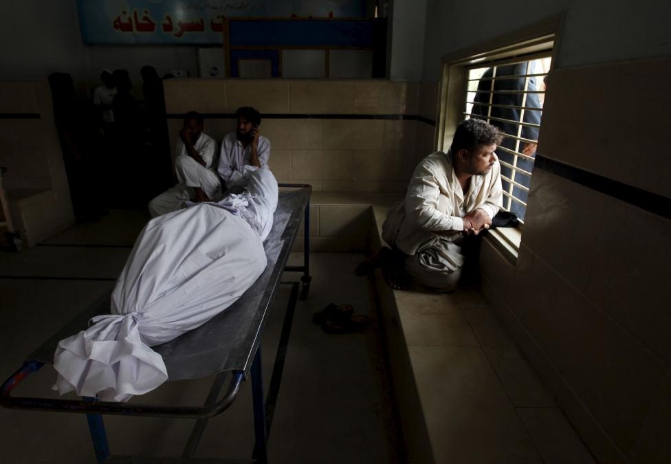 Nhân viên tình nguyện chờ gia đình nạn nhân lấy quan tài về khâm liệm. Nắng nóng gây ra tình trạng thiếu điện trên nhiều khu vực, bao gồm cả thủ thành phố Karachi. |