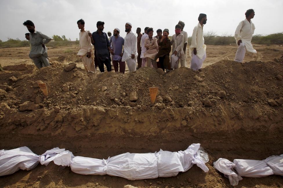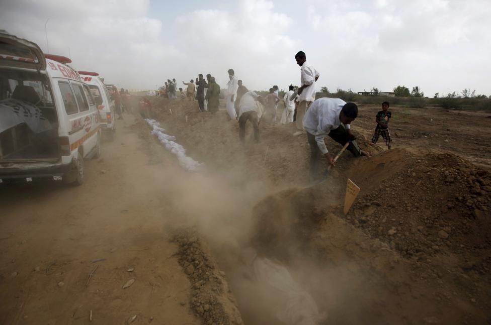 Trong ngày 26 và 27/6, nhà chức trách Pakistan chôn tập thể 140 người chết vì nắng. Reuters dẫn lời người phụ trách Tổ chức từ thiện Edhi cho biết, tính tới ngày 26/5, số nạn nhân thiệt mạng vì nắng nóng đã lên tới 1.150, với 200 tử thi chưa thể xác định danh tính. Giới chức huy động máy xúc để đào mộ. |
