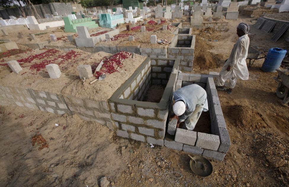 Những ngôi mộ mới mọc lên san sát tại nghĩa địa ở Karachi. Phu mộ phải làm việc vất vả trong nắng nóng vì số người chết tăng đột biến. |