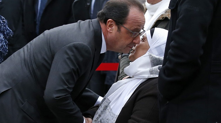 Tổng thống Hollande chào mẹ của cảnh sát Ahmed Merabet, người bị giết trong vụ khủng bố tháng 1/2015. Ảnh: AP |