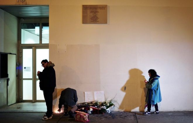 Người dân Paris đặt hoa và nến tại văn phòng cũ của tạp chí Charlie Hebdo tưởng niệm một năm những kẻ khủng bố xông vào tòa soạn xả súng khiến 12 người thiệt mạng. Ảnh: AP |