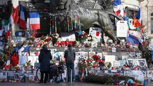 Hoa và quốc kỳ tưởng niệm các nạn nhân ở quảng trường Place de la Republique trong những ngày qua. Vụ tấn công ngày 7/1/2015 của anh em Said và Cherif Kouachi được coi là vụ 11/9 ở Pháp, đánh dấu khởi đầu một chuỗi các cuộc tấn công tại nước này sau đó. Vụ khủng bố ở Paris khiến 130 người chết ngày 13/11/2015 là vụ việc đẫm máu nhất. Vụ thảm sát tại trụ sở tòa soạn Charlie Hebdo lại trở thành biểu tượng của tinh thần đoàn kết về tự do ngôn luận khi những tấm biển “Tôi là Charlie” xuất hiện trên toàn thế giới. Ảnh: Reuters |