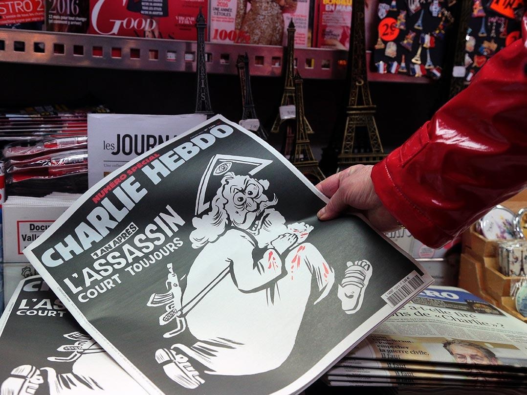 Ngày 6/1, tạp chí Charlie Hebdo tung ra ấn phẩm đặc biệt với bức ảnh biếm họa Thượng đế dùng súng để tưởng niệm 1 năm vụ tấn công. Trang bìa của số báo đặc biệt có hình Thượng đế râu dài, đi dép, mặc trang mục dính máu và đeo khẩu súng Kalashnikov qua vai cùng với tiêu đề “Một năm sau, kẻ giết người vẫn nhởn nhơ”. Tòa soạn Charlie Hebdo trở thành mục tiêu tấn công khi xuất bản các biếm họa của nhà tiên tri Mohammed khiến các phần tử Hồi giáo cực đoan tức giận. Ảnh: AFP |