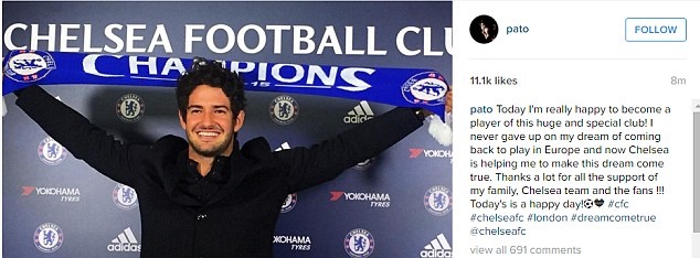| Tiền đạo Pato trở thành tân binh đầu tiên của Chelsea trong tháng 1/2016. Anh sẽ thi đấu cho "The Blues" theo hợp đồng mượn từ Corinthians đến cuối mùa giải. |