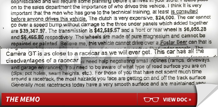 Cụ thể, văn bản có nói đến thiết kế và cấu tạo của Porsche Carrera GT gần giống với một chiếc xe đua thực sự, nên dòng xe này cũng gặp phải những bất lợi về kỹ thuật như xe đua trong một số tình huống mặt đường không đảm bảo. Hãng còn khuyến cáo chủ xe không nên tùy tiện cho mượn, bởi người không quen với thiết kế xe có thể lạc tay lái.