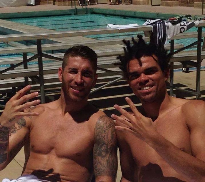 | Ramos hao hứng chụp hình cùng tóc mới của Pepe tại bể bơi. |