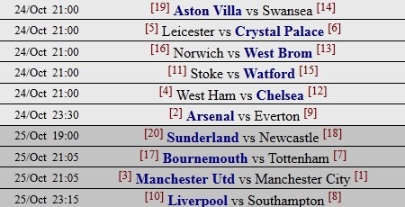 | Lịch thi đấu vòng 10 Premier League. Trận cầu tâm điểm là cuộc đụng độ giữa hai đội bóng thành Manchester, MU và Man City diễn ra trên sân Old Trafford lúc 21h05 ngày 25/10. |