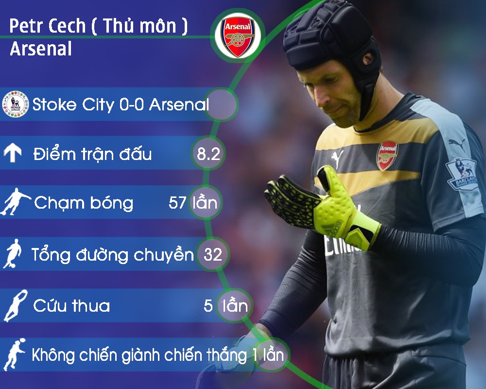 Thủ môn người Séc, Petr Cech thực hiện 5 pha cứu thua trong trận làm khách đến sân của Stoke, qua đó giúp Arsenal có 1 điểm để tiếp tục giữ ngôi đầu trên bảng xếp hạng sau vòng 22.