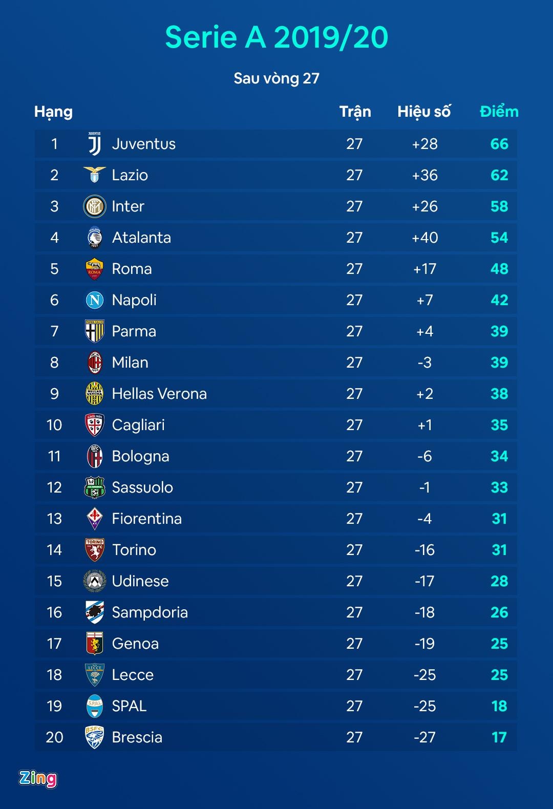 Ở trận đấu diễn ra sau đó ít giờ, Lazio cũng bất ngờ nhận thất bại trước Atalanta. Ciro Immobile giúp Lazio dẫn trước 2-0 chỉ sau 11 phút nhưng họ lại để đối thủ thắng ngược 3-2. Với kết quả này, Juventus tràn trề cơ hội bảo vệ ngôi vô địch khi khoảng cách với đội đứng thứ 2 đang là 4 điểm.