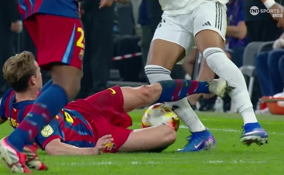 Phút 90+1 chứng kiến tình huống gây tranh cãi từ De Jong. Khi Barca đang dẫn trước 3-2 và trận đấu chỉ còn tính bằng giây, tiền vệ người Hà Lan lao vào Mbappe bằng một pha xoạc bóng quyết liệt. De Jong giơ cao gầm giày và trúng vào phần ống chân của tiền đạo Real Madrid.