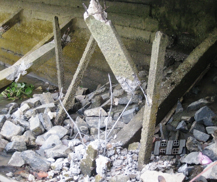 Cú va chạm rất mạnh khiến 4 trụ chống bằng bê tông cốt thép bị gãy, trong đó 3 trụ đứt lìa khỏi sàn nhà, một trụ gãy trơ sắt. Phía trên sàn, 3 trụ chống mái bằng xi măng bị gãy lìa, nghiêng ra phía bờ sông.
