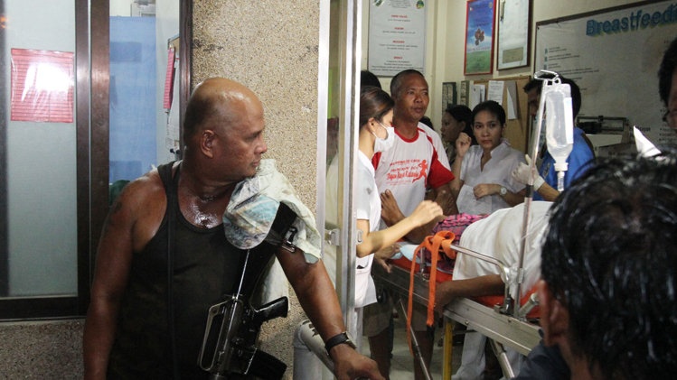 | Nhân viên an ninh bảo vệ những người sống sót trên phà MV Thomas Aquinas trong một bệnh viện ở thành phố Cebu vào tối 16/8. Ảnh: AP. |