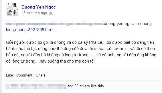 Chiều ngày 24/7, cô chia sẻ trên trang cá nhân: “Gửi người được tôi gọi là chồng và cô ca sĩ Pha Lê. Tôi được biết cô đang tiến hành các thủ tục cũng như thủ đoạn để đưa tôi ra tòa, cô cứ làm và tôi sẽ theo hầu cô, người đàn bà không có lòng tự trọng. Và cả anh, người đàn ông không có lòng tự trọng. Hãy buông tha cho mẹ con tôi”.