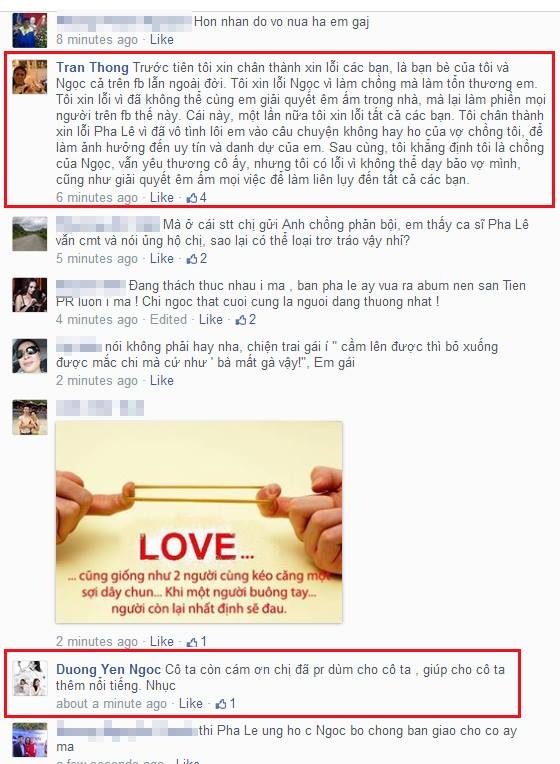 Tuy nhiên, trong chia sẻ này, Trần Thông – ông xã Dương Yến Ngọc - thẳng thắn phủ nhận nghi vấn về mối quan hệ tình cảm với Pha Lê. Theo anh, bà xã đang quá ghen nên không giữ được bình tĩnh. Với tư cách một người chồng, anh cho biết vẫn còn yêu thương và không muốn ly hôn với Dương Yến Ngọc: "Tôi khẳng định tôi là chồng của Ngọc, vẫn yêu thương cô ấy, nhưng tôi có lỗi vì không thể dạy bảo vợ mình, cũng như giải quyết êm ấm mọi việc để làm liên lụy đến tất cả các bạn".