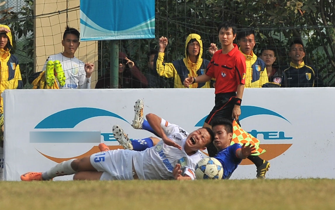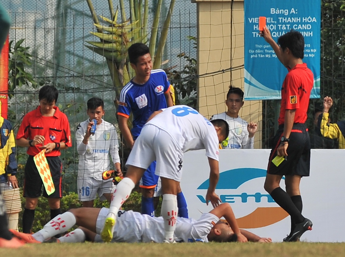 | Cầu thủ Phạm Văn Tới của Hà Nội T&T tỏ ra rất đau đớn sau pha bị phạm lỗi. Lúc này U19 Hà Nội T&T đang dẫn trước U19 Than Quảng Ninh với tỷ số 4-1. |