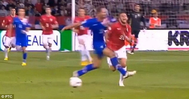 | Pha quay chậm cho thấy hậu vệ này còn thúc cả khuỷu tay vào lưng của Sulejmani. |