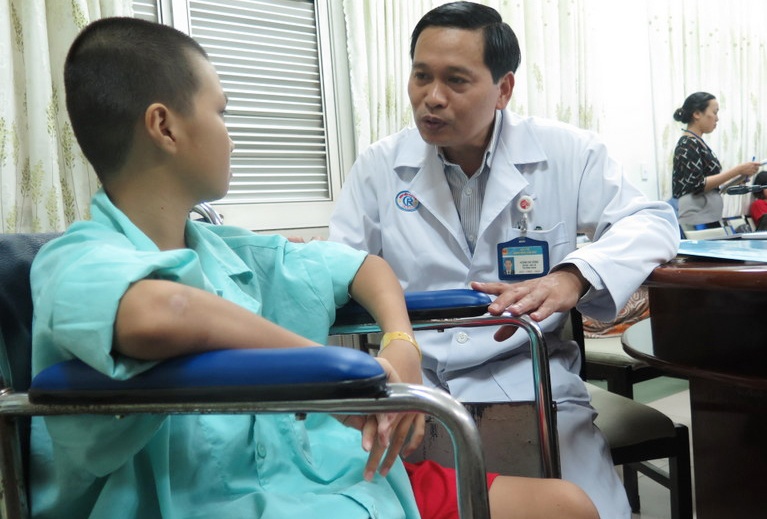 | BS Hoàng Bá Dũng -Trưởng Khoa Tai Mũi Họng dặn dò bệnh nhân Phúc trước lúc em xuất viện. Ảnh: Khánh Trung. |