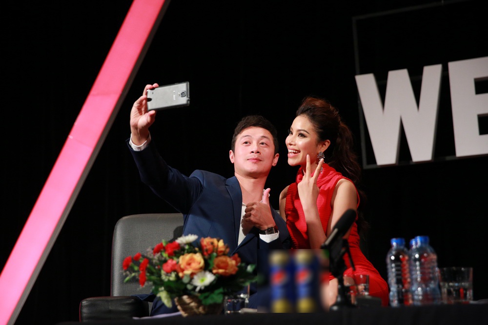 | Khoảnh khắc selfie dễ thương của MC Anh Tuấn và Phạm Hương. |