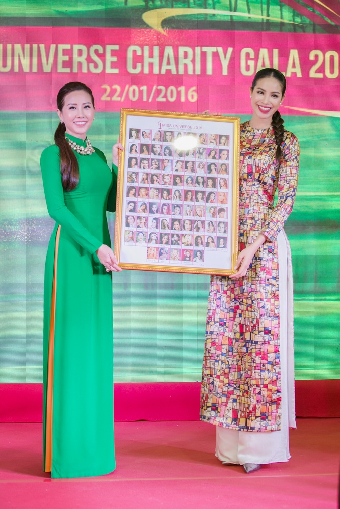 | Hoa hậu Hoàn vũ Việt Nam duyên dáng trong tà áo dài cổ điển, tóc tết đơn giản đến sự kiện. Trong các hoạt động của cuộc thi, hoa hậu các nước đã vui vẻ ký tên khi nghe đại diện Việt chia sẻ ý nghĩa bức ảnh. |