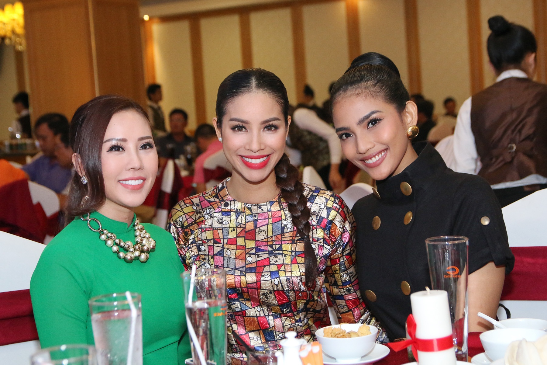 | Phạm Hương thân thiết với Thu Hoài và Trương Thị May trên bàn tiệc. |