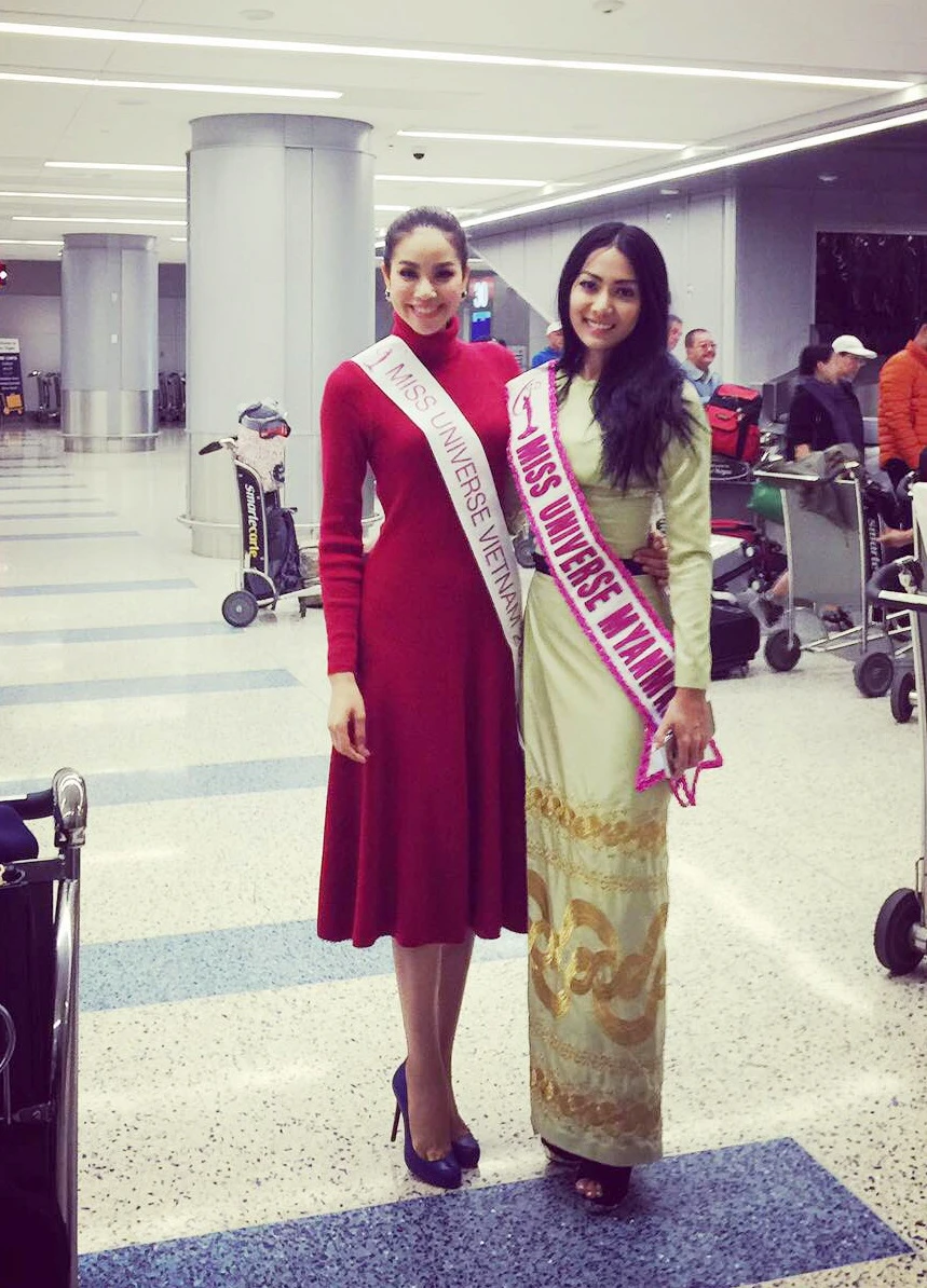 | Đáp xuống sân bay tại Las Vegas, Mỹ vào sáng 3/12 (theo giờ Việt Nam), Phạm Hương tình cờ gặp đại diện Myanmar - hoa hậu May Barani Thaw. Nhận ra thí sinh thi Hoa hậu Hoàn vũ Thế giới, hai người đẹp bắt chuyện làm quen. Phạm Hương diện váy thu đông kín đáo, còn hoa hậu Myanmar duyên dáng trong trang phục truyền thống. |