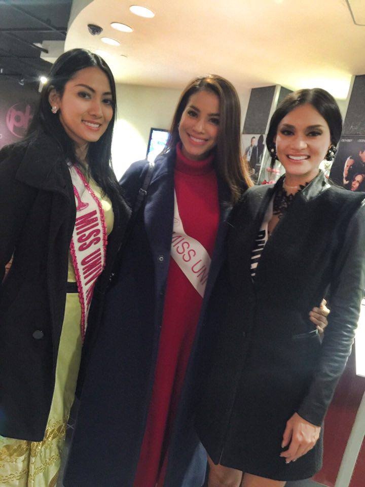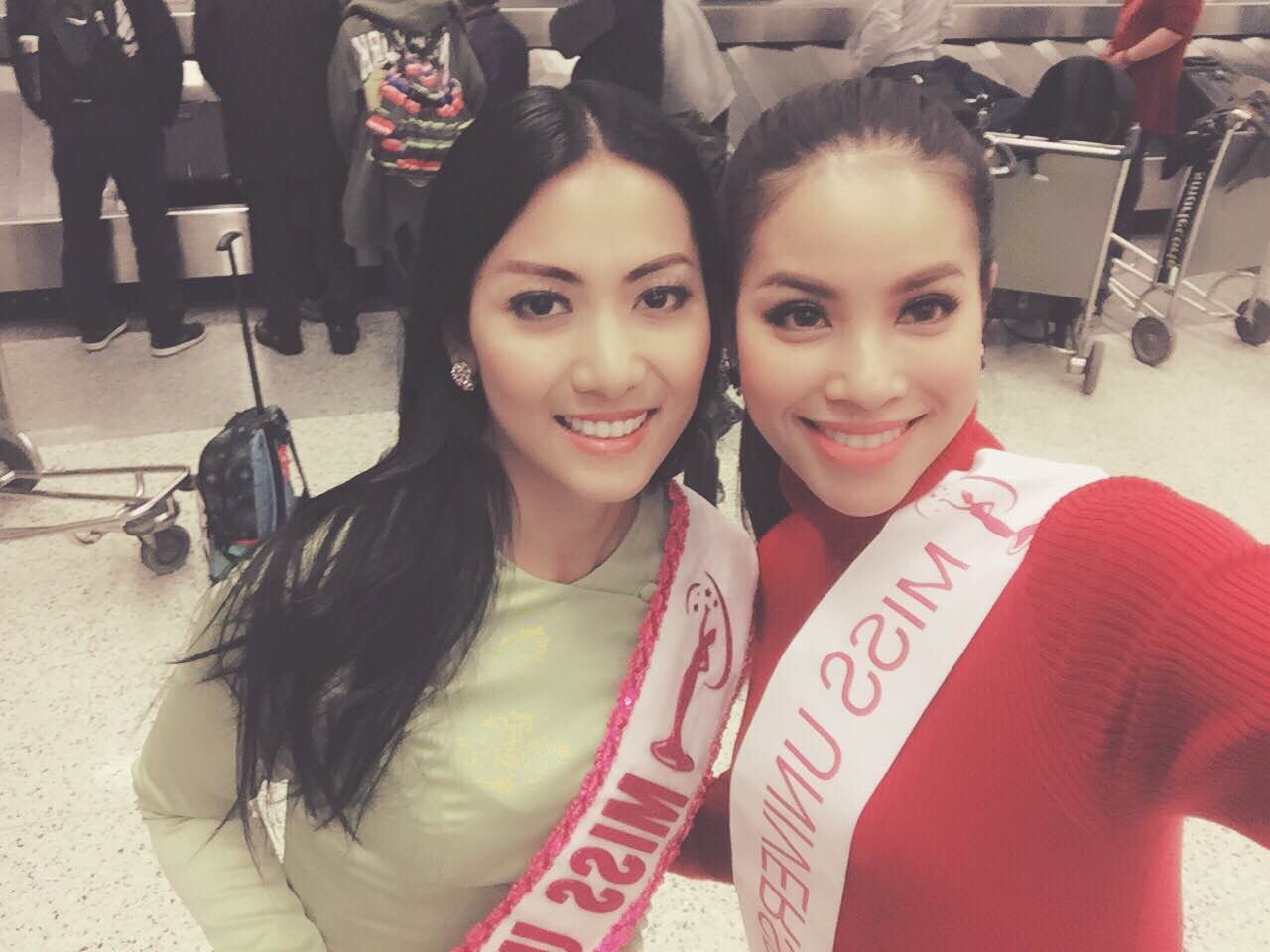 | Hoa hậu Hoàn vũ Việt Nam 2015 rạng rỡ và nổi bật khi chụp ảnh cùng người đẹp đất nước chùa vàng. Phạm Hương chia sẻ, cô khá thoải mái sau chuyến bay, khí hậu Las Vega dễ chịu. |