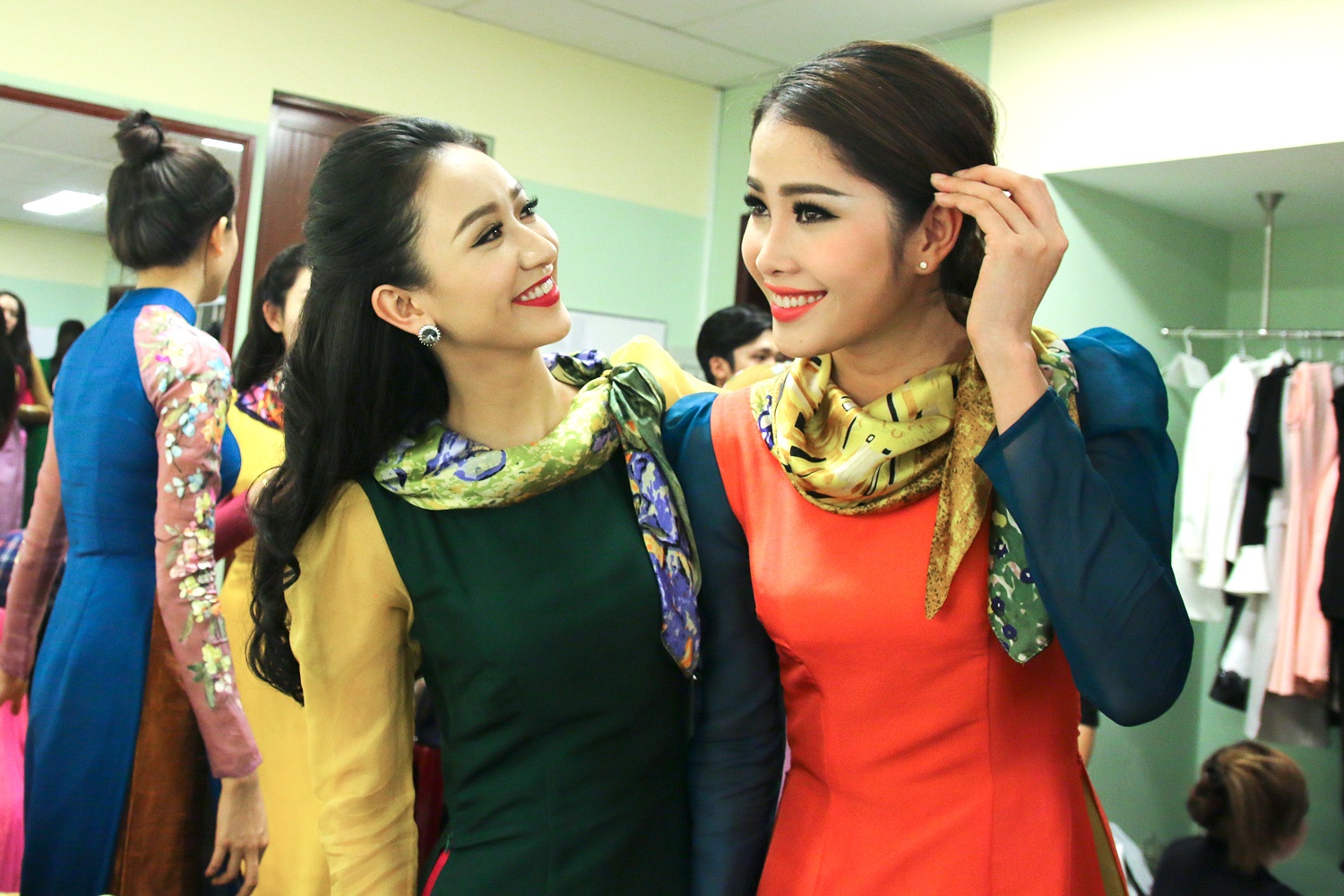 So với đàn chị Phạm Hương, á hậu Liên lục địa 2015 Hà Thu (trái) và hoa khôi Đồng bằng Sông Cửu Long Nam Em còn khá bỡ ngỡ. |