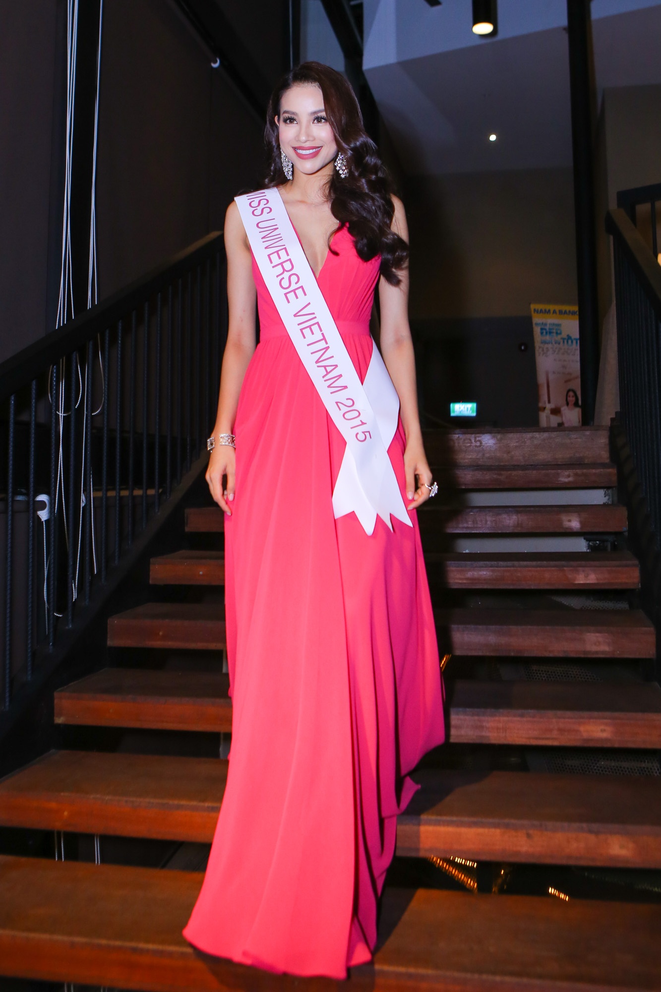 Trước ngày lên đường tham gia Hoa hậu Hoàn vũ Thế giới 2015, Phạm Hương có buổi giao lưu với truyền thông chiều 30/11, tại TP HCM. Người đẹp sinh năm 1991 nổi bật trong bộ váy sắc đỏ cam, xẻ ngực gợi cảm.