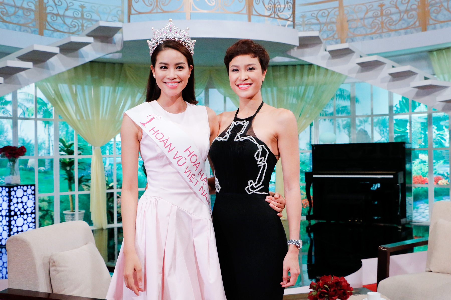 | Phạm Hương và MC Phương Mai trong chương trình Vui sống mỗi ngày. |