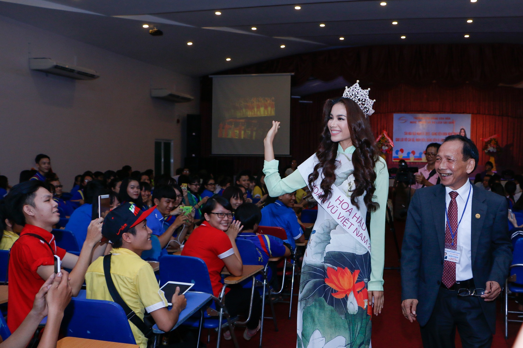 Về thăm ngôi trường mình đang công tác là mong mỏi đầu tiên của tân hoa hậu sau đêm đăng quang.