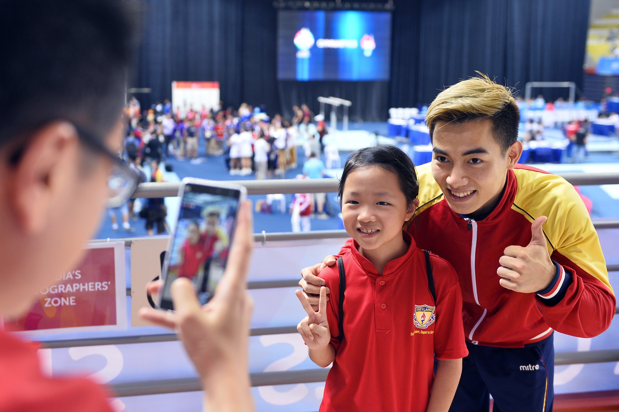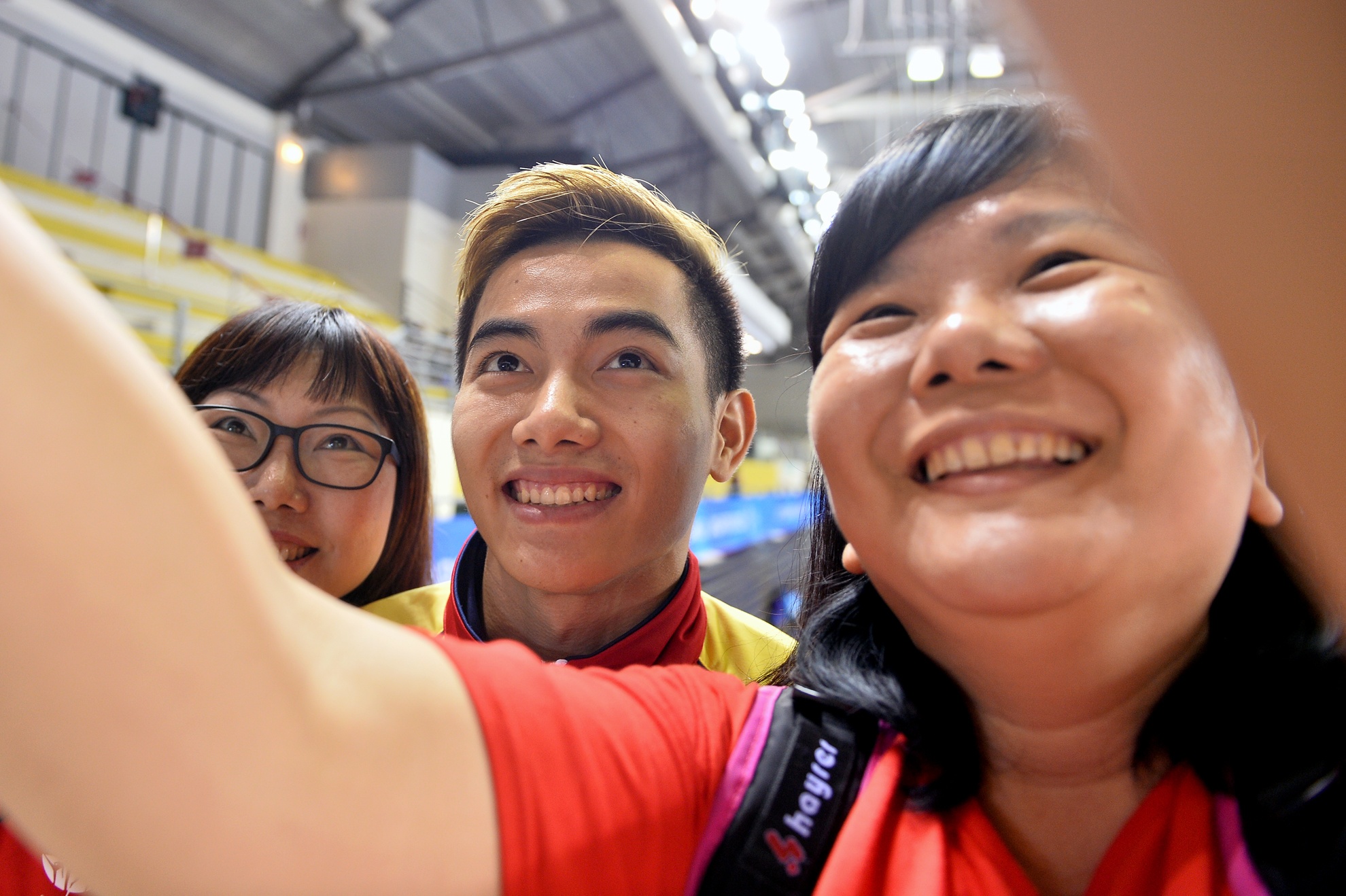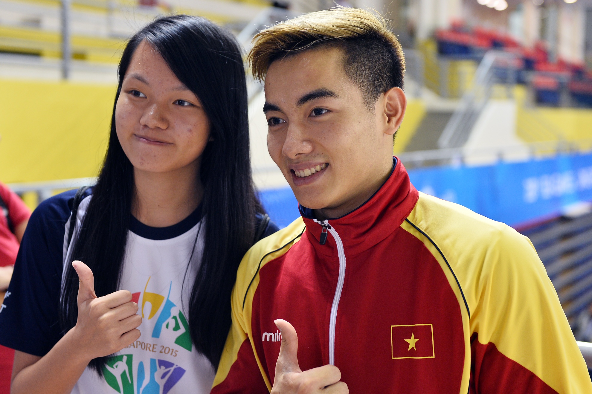 | Các tình nguyện viên tại SEA Games 28 cũng không bỏ lỡ cơ hội ghi lại khoảnh khắc bên VĐV điển trai. |