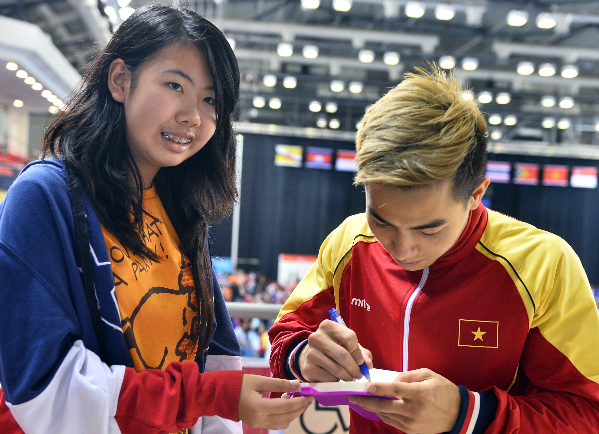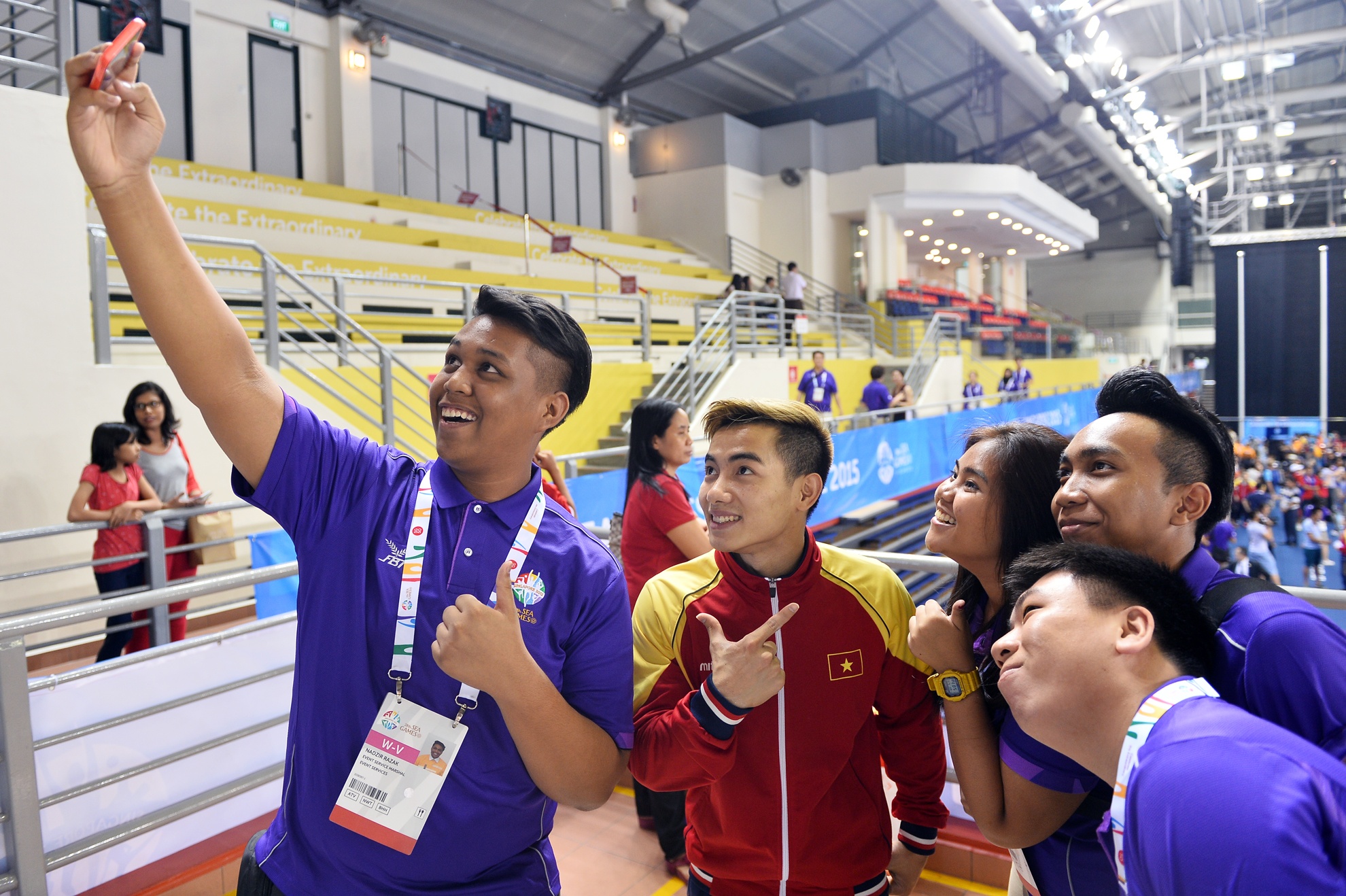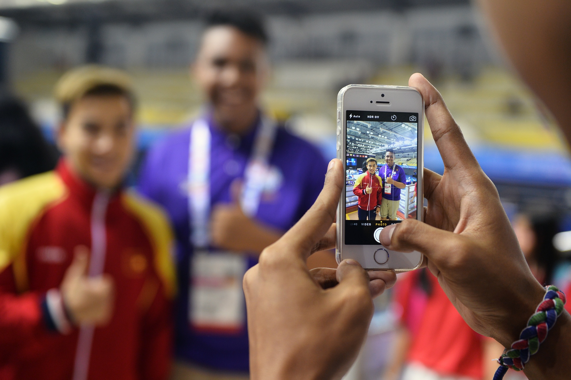 | Các tình nguyện viên tại SEA Games 28 cũng không bỏ lỡ cơ hội ghi lại khoảnh khắc bên VĐV điển trai. |