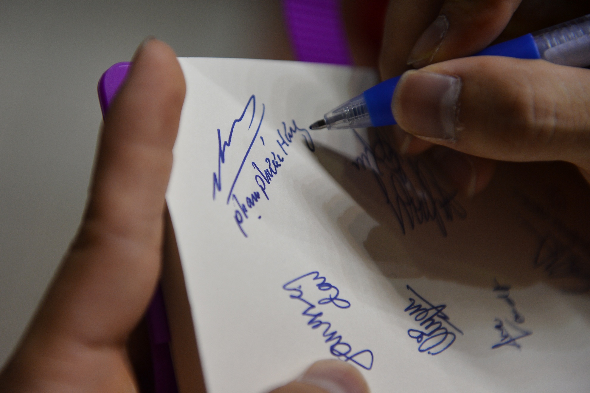 | Chàng trai người Hà Nội vui vẻ ký tặng fan nữ... |