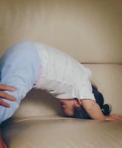 | Bella được mẹ khen dũng cảm khi cúi đầu tập nhào lộn. |