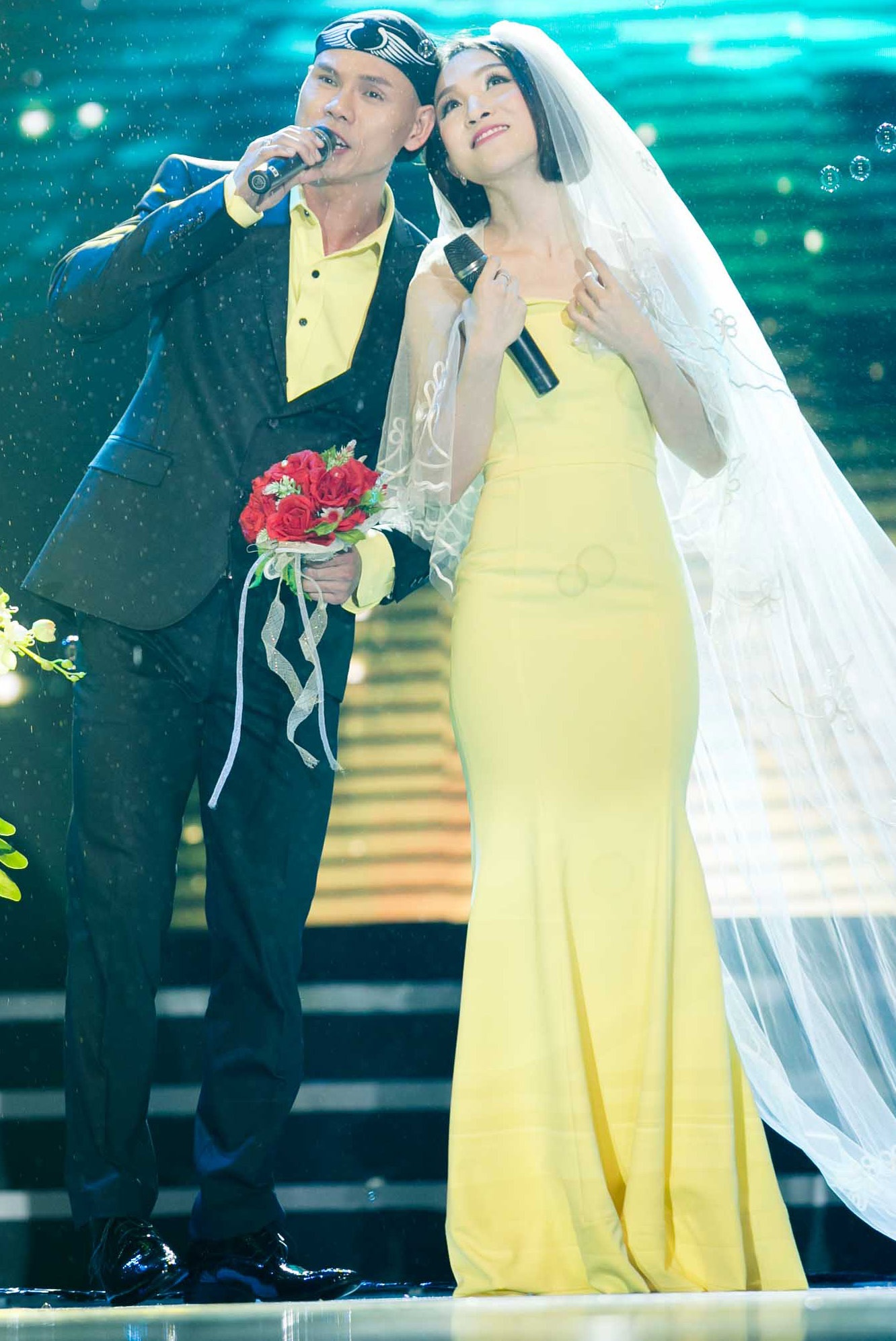 | Trên sân khấu trực tiếp, giọng ca sinh năm 1975 không ngại thể hiện tình cảm dành cho bà xã xinh đẹp. Vừa song ca, anh vừa nhẹ nhàng đặt lên má Thái Ngọc Bích nụ hôn ngọt ngào khiến khán giả thích thú. |