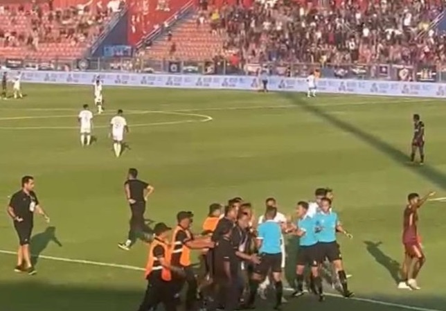 Khung cảnh hỗn loạn xảy ra khi cầu thủ và CĐV Persik Kediri phản đối trọng tài. |