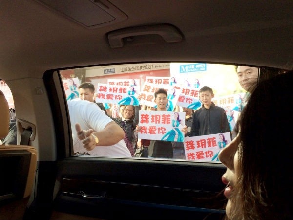 | Nhiều người hiếu kỳ bủa vây quanh Cung Nguyệt Phi để được quay phim, chụp hình. Có người hâm mộ còn hét lớn: “Anh yêu em”. |
