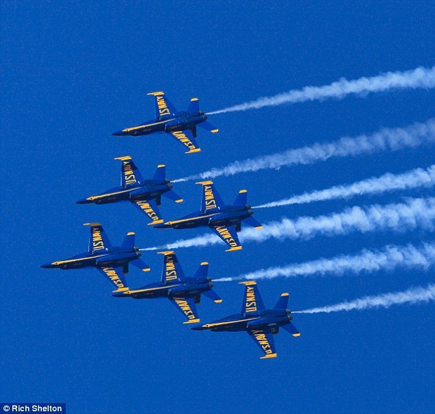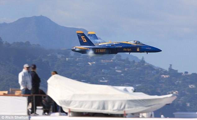 Đội bay trình diễn "Những thiên thần màu xanh" của Hải quân Mỹ khiến người xem mãn nhãn khi lao vút qua cầu Cổng Vàng với vận tốc cực nhanh.
