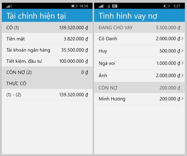 | Hình ảnh giao diện Sổ Thu Chi trên Windows Phone. |