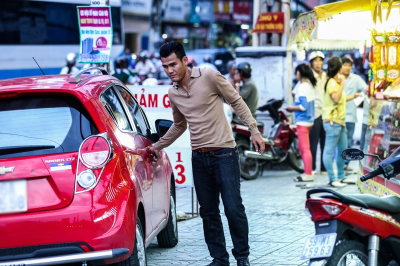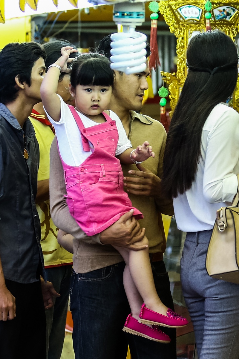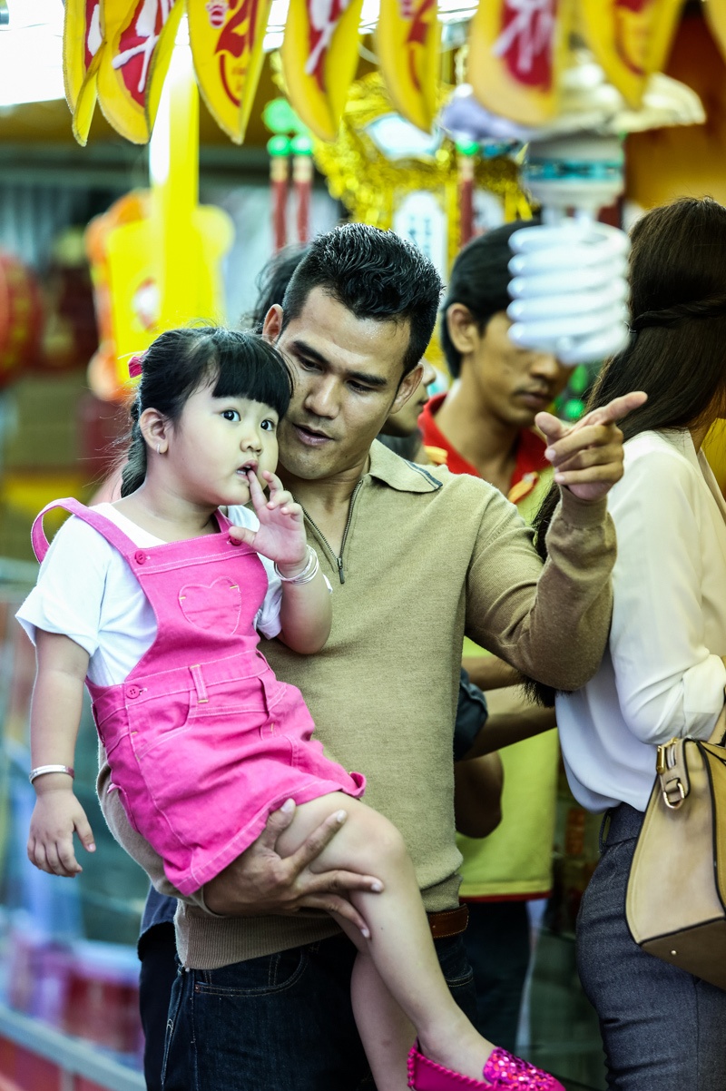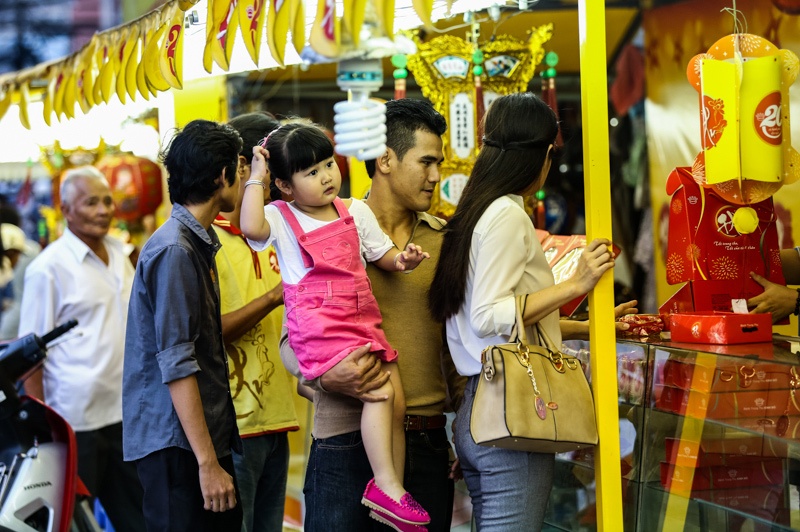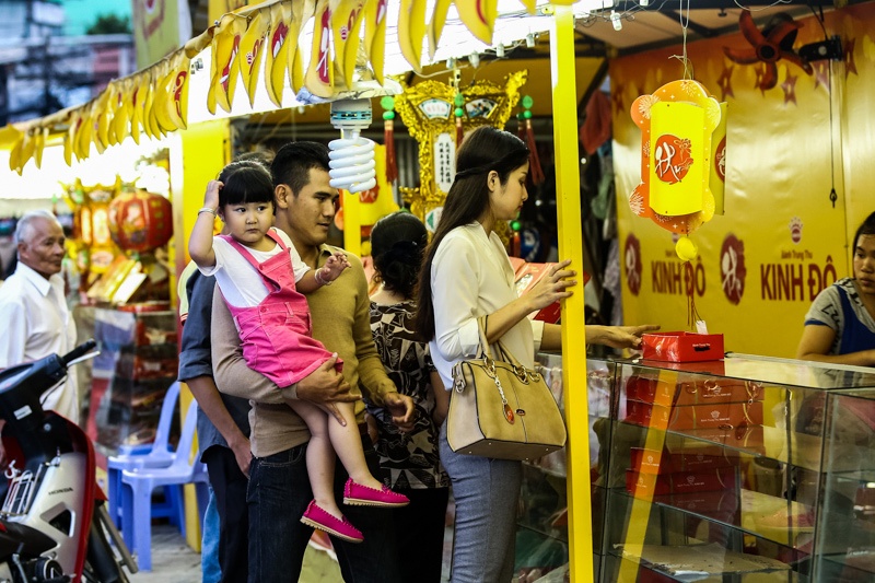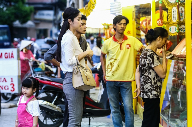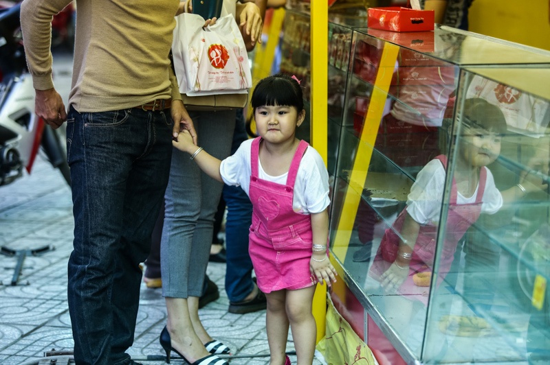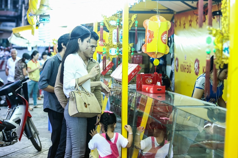 | Trong khi Phan Thanh Bình loay hoay tìm chỗ đậu xe, Thảo Trang dắt con đi mua bánh Trung thu. |