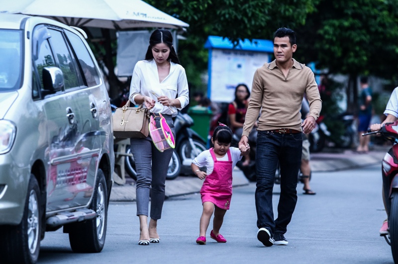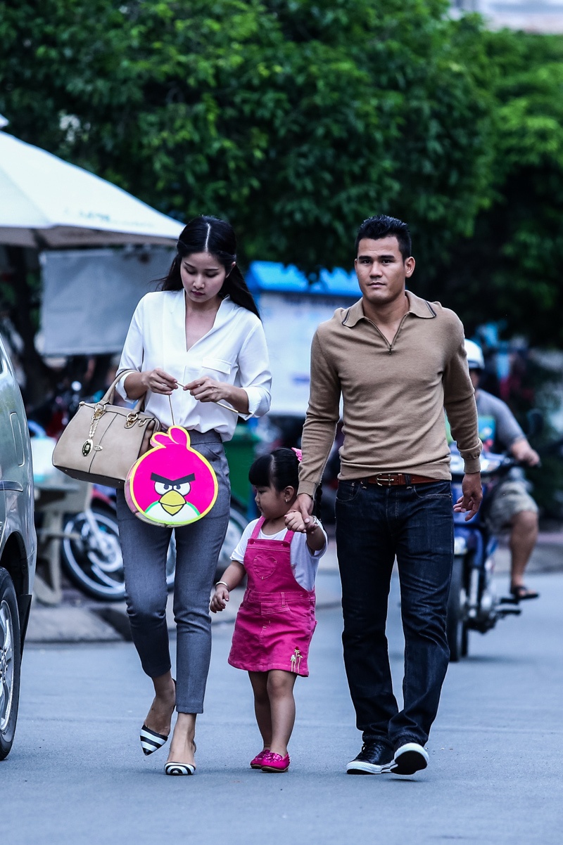 Hòa vào không khí Tết Trung thu, vợ chồng cầu thủ - người mẫu cũng đưa con ra phố mua sắm. Cặp đôi chọn một con phố gần nhà, thoáng rộng để dắt con gái đi bộ.