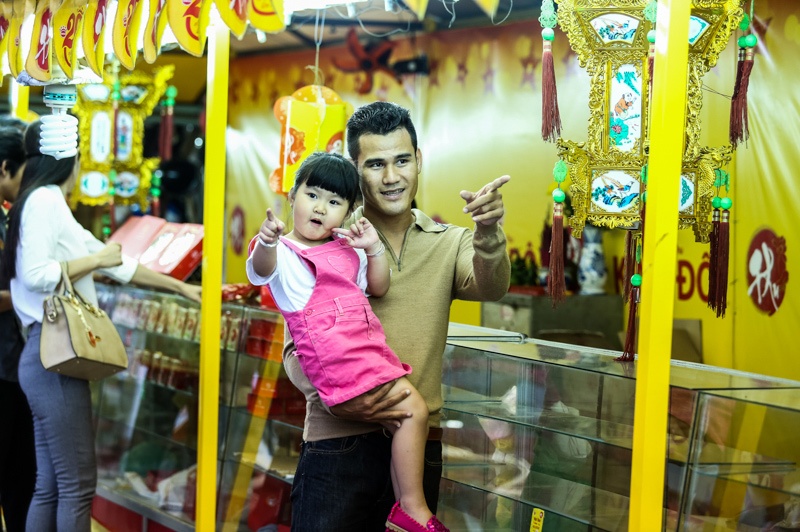Chiều qua 19/9, tiền đạo Đồng Tâm Long An và bà xã Thảo Trang đưa con gái đi mua bánh và lồng đèn Trung thu.