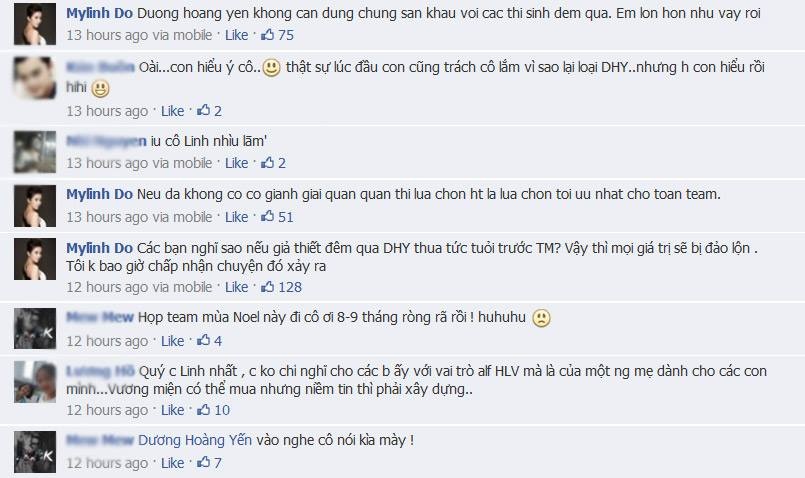 Trong một status khác, huấn luyện viên này cũng liên tục comment qua lại cùng khán giả với nội dung xung quanh việc Dương Hoàng Yến bị loại quá sớm. Cô viết: “Các bạn nghĩ sao nếu giả thiết đêm qua Dương Hoàng Yến thua tức tưởi trước Thảo My? Vậy thì mọi giá trị sẽ đảo lộn. Tôi không bao giờ chấp nhận sự việc đó xảy ra”.