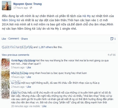 Anh viết: “Điều đọng lại với mình là sự chân thành có phần tồ tệch của Hà My, sự nhiệt tình của Năm Dòng Kẻ và nhất là sự dại dột của bản thân. Thôi hẹn các bạn vào 1 chương trình mới 2014. Nơi mà mình sẽ không mở mồm ra bao giờ nữa cả. Để dành chỗ cho âm nhạc. Mình nợ các bạn Năm Dòng Kẻ một dự án và Hà My 1 single nhé”.