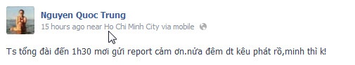 Huấn luyện viên Quốc Trung viết: “Tổng đài đến 1h30 mới gửi report cảm ơn. Nửa đêm điện thoại kêu phát rồ, mình thì không!”