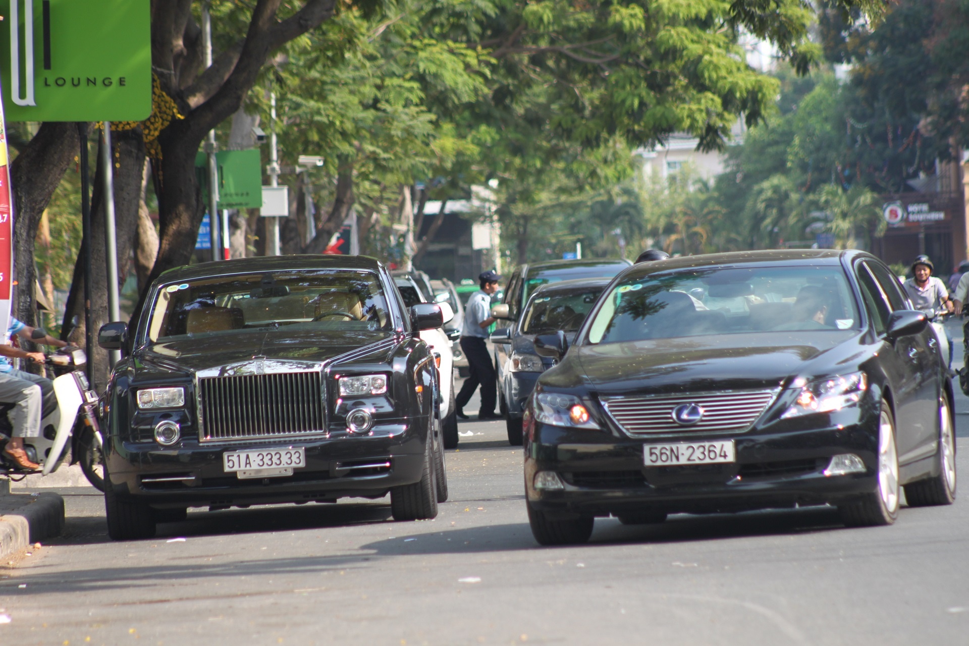 | Sáng 21/7, tại khu đô thị Phú Mỹ Hưng, quận 7, TP. HCM, một đám rước dâu đã diễn ra, gây chú ý với dàn xe sang 6 chiếc. Dẫn đầu là xe hoa màu trắng hiệu Mercedes E-Class, tiếp theo là chiếc SUV Lexus LX570 màu đỏ bordeaux. Chiếc Rolls-Royce Phantom rồng đi thứ ba, là xe đắt nhất tham gia đoàn rước dâu này. Ngoài ra, còn một chiếc Porsche Cayenne và hai chiếc Bentley Continental Flying Spur đi phía sau. Hộ tống đoàn rước dâu là 8 chiếc siêu mô tô, bao gồm 3 chiếc Kawasaki Z1000, 4 chiếc Ducati và một chiếc Honda CB1000R. Đây là hình ảnh chiếc Rolls-Royce Phantom Year of Dragon thường xuyên xuất hiện tại Phú Mỹ Hưng. |